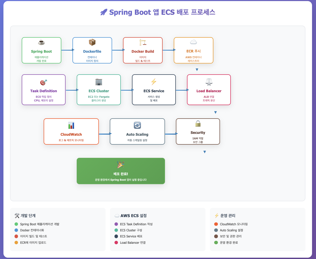 Spring Boot 앱을 ECS에 자동 배포하려면, 여러 AWS 리소스를 미리 만들어야 해요. 대표적으로 보안 그룹, 로그 그룹, IAM 역할, ECR 저장소, ECS 클러스터, 태스크 정의, 그리고 서비스가 필요합니다. 각각의 리소스가 어떻게 연결되는지 이해하면 전체 흐름이 명확해져요.